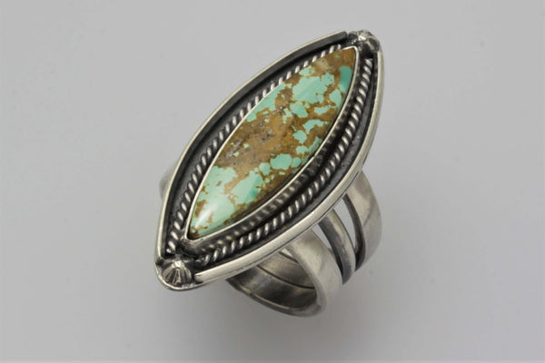 This is a high grade Royston. The matrix is just stunning! Small stones on each side are Carico Lake. This piece was finished with an 8 Gauge sterling silver half round wires.